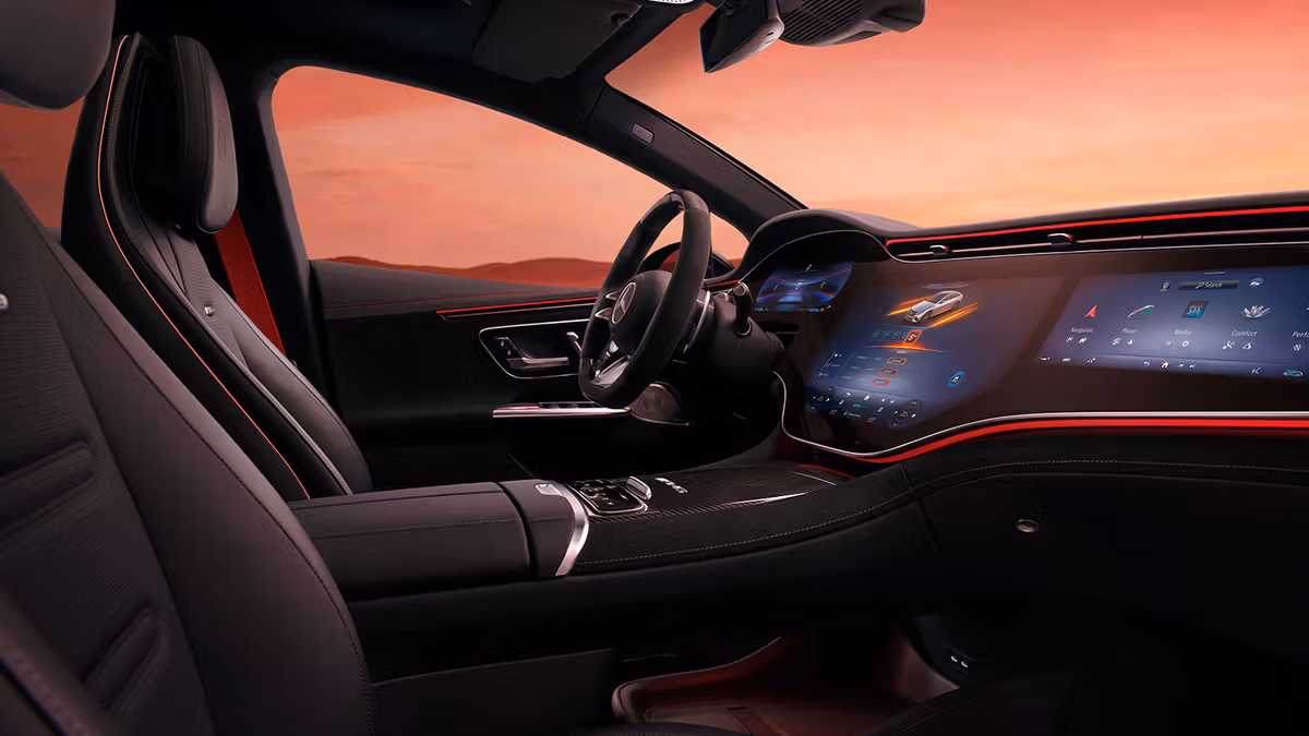 The interior of the Mercedes-AMG EQE 53 4MATIC+ transmits the electrical power seamlessly into the inside: the fascinating MBUX Hyperscreen emphasises the electrified experience, while particular details such as red contrasting stitching, AMG seats with high-quality graphics and the AMG Performance steering wheel complete the dynamic look.